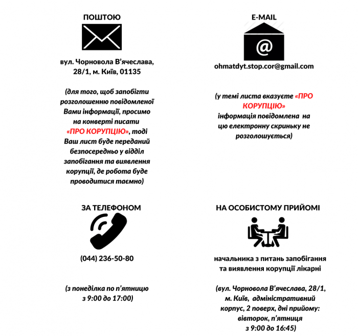 Якщо ви вважаєте, що у нашій лікарні є випадки корупції чи зіштовхнулися з таким фактом, будемо вдячні Вам за повідомлення про це.