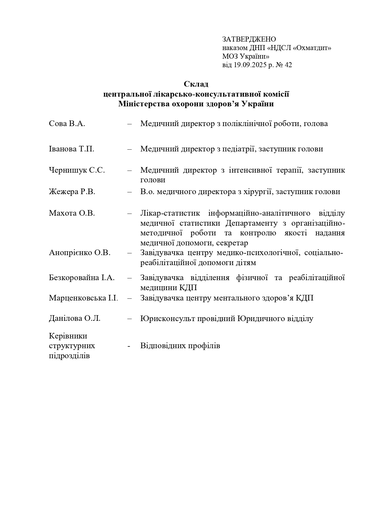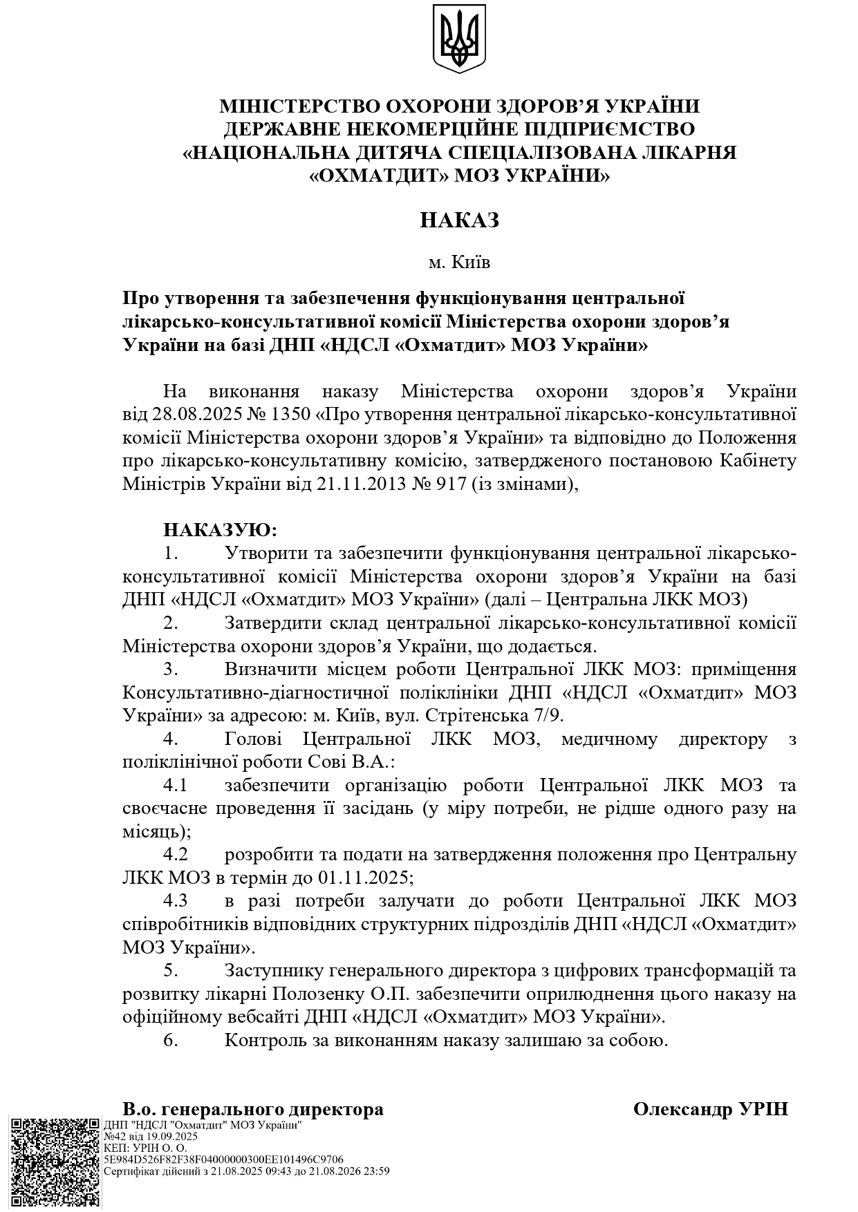 На виконання наказу Міністерства охорони здоров’я України від 28.08.2025 № 1350 «Про утворення центральної лікарсько-консультативної комісії Міністерства охорони здоров’я України» та відповідно до Положення про лікарсько-консультативну комісію, затвердженого постановою Кабінету Міністрів України від 21.11.2013 № 917 (із змінами).