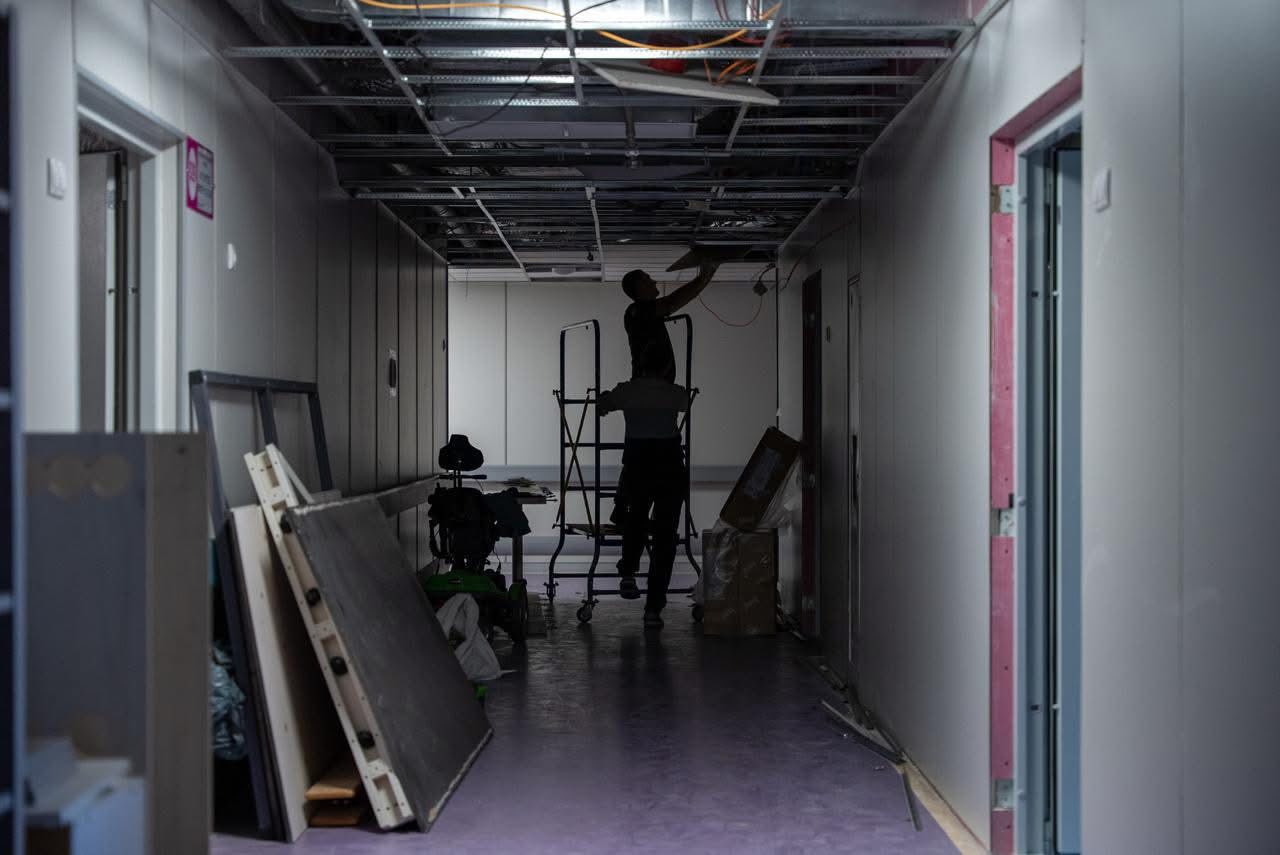 Паралельно триває оновлення внутрішніх приміщень у трьох блоках: проводяться роботи з демонтажу та монтажу стель, стін, відкосів і вікон, оновлюються гіпсокартонні конструкції, штукатурка, радіатори й освітлення.